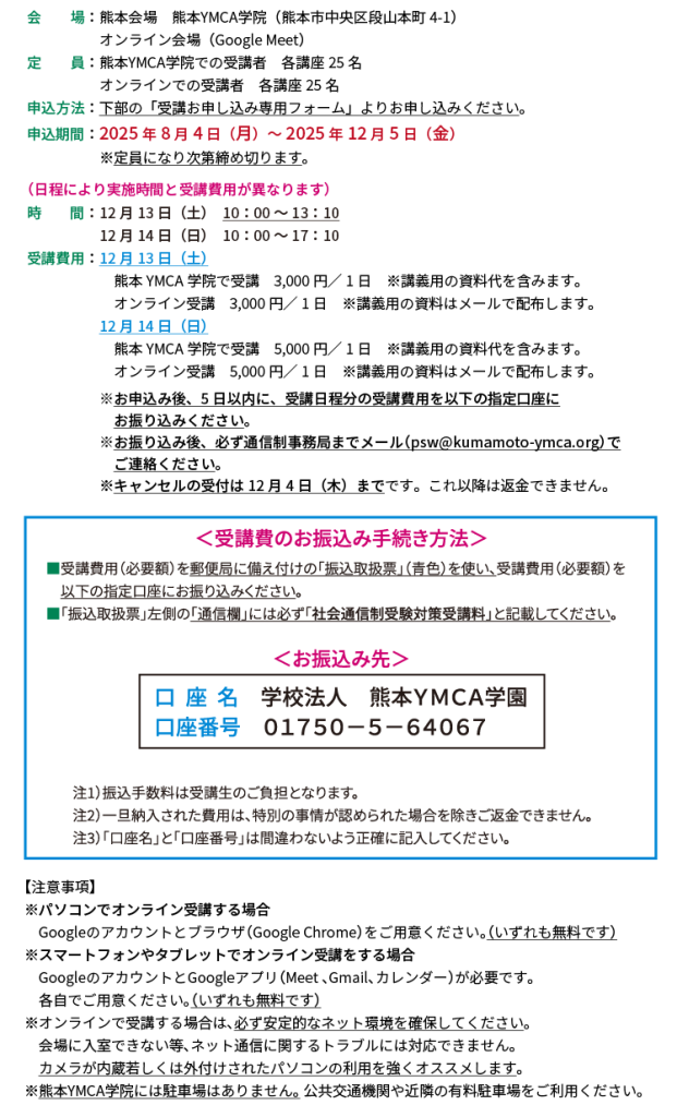 熊本YMCA学院 通信制(社会福祉学科・精神保健福祉学科)〒860-8739 熊本市中央区段山本町4番1号TEL:096-353-6393(音声ガイダンス④) FAX:096-324-7877