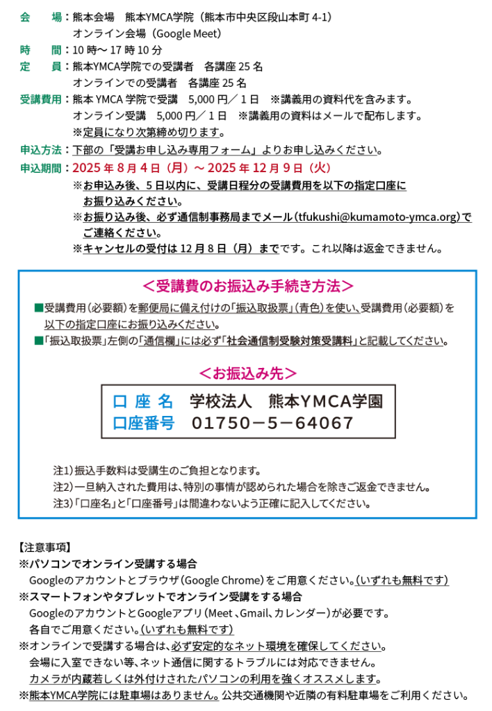 受講をご希望の方は、開催日程・内容、注意事項等をよくご確認の上、