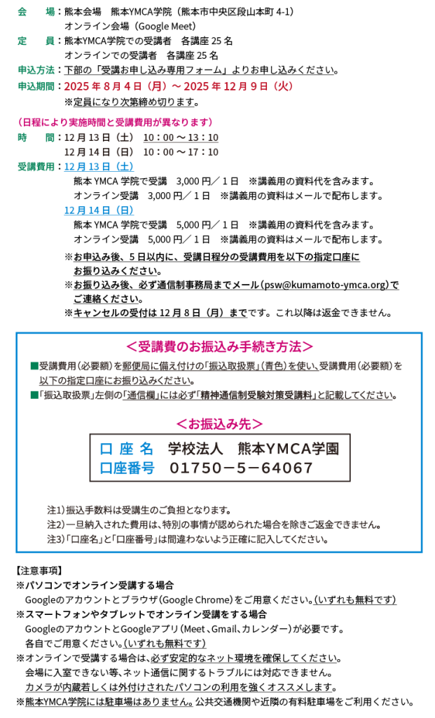 受講をご希望の方は、開催日程・内容、注意事項等をよくご確認の上、